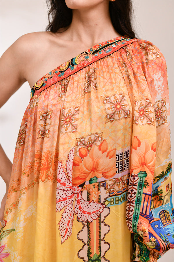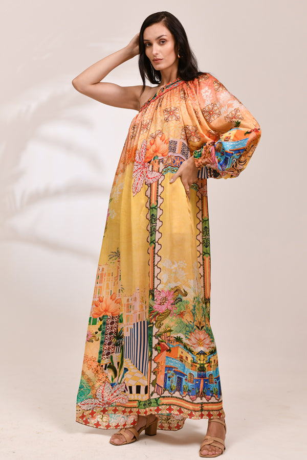 A statuesque addition to the collection, this one-shoulder maxi gown features a dramatic, voluminous puffed sleeve and a fluid, floor-skimming drape. The Virelle signature print is beautifully showcased in warm honey and sunset tones, creating a bold, asymmetrical silhouette that epitomizes high-end resort glamour.