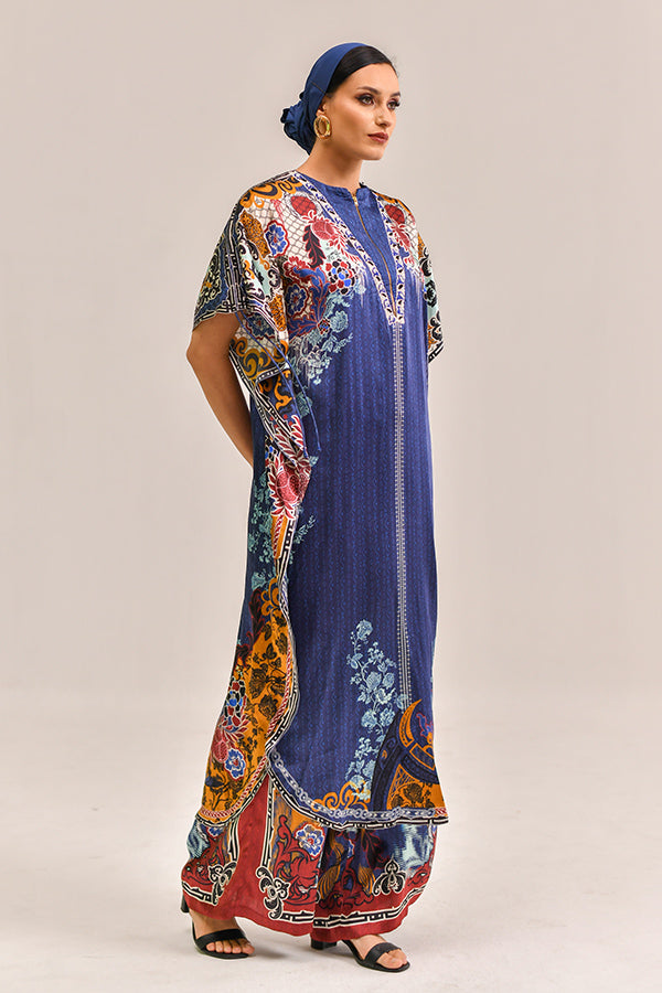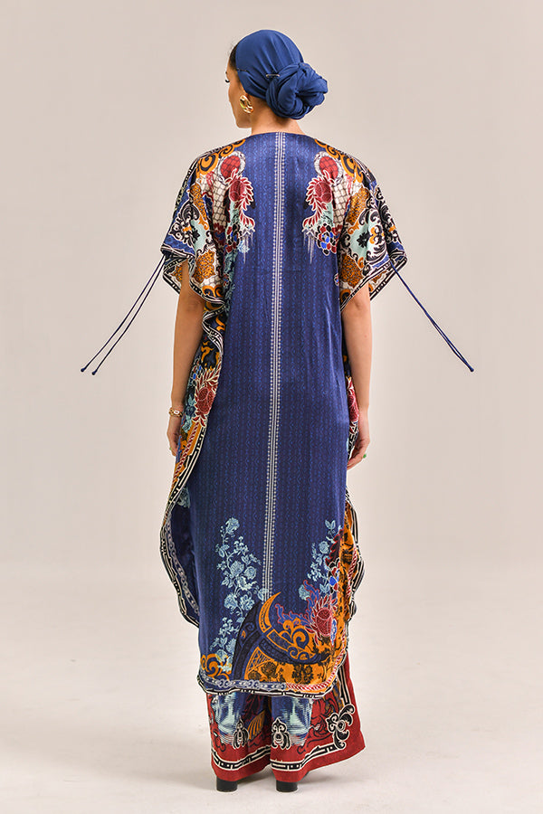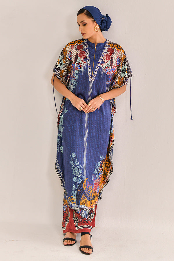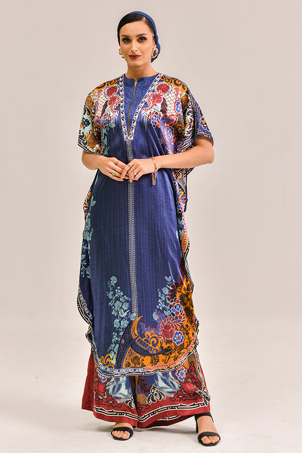 The Halo Blue Co-ord Set by Bhanuni by Jyoti exudes regal elegance through a rich deep navy base adorned with intricate ornamental and floral prints in shades of rust, crimson, and teal. This luxurious two-piece ensemble features a relaxed zip-front kaftan tunic paired with matching wide-leg palazzos, creating a silhouette that balances modern comfort with refined sophistication. An effortless choice for elegant evenings, festive gatherings, and elevated resort wear.