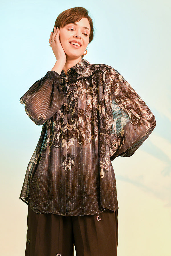 The deep noir canvas serves as the perfect backdrop for delicate, scattered embellishments—small, star-like motifs that catch the light to create a subtle, shimmering effect. Combining the comfort of resort wear with the sophistication of evening attire, these pants are an essential staple for the modern wardrobe