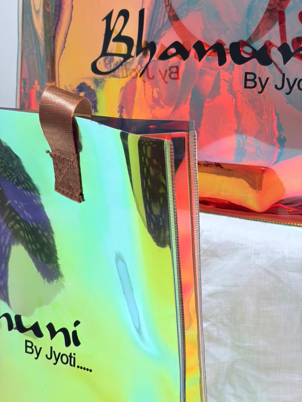 A high-gloss translucent tote with prism-inspired color shifts, structured form, and refined leather handles designed for modern resort luxury. Spacious and lightweight, the Prism Flux Tote transitions seamlessly from resort days to city evenings perfect for carrying essentials while adding a bold yet sophisticated touch to your look.