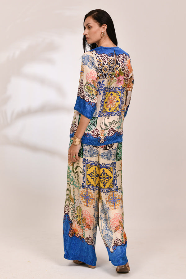 Featuring a sophisticated boat neckline and elbow-length flared sleeves, this top showcases an intricate patchwork of Mediterranean tile motifs framed by a striking cobalt blue border.
