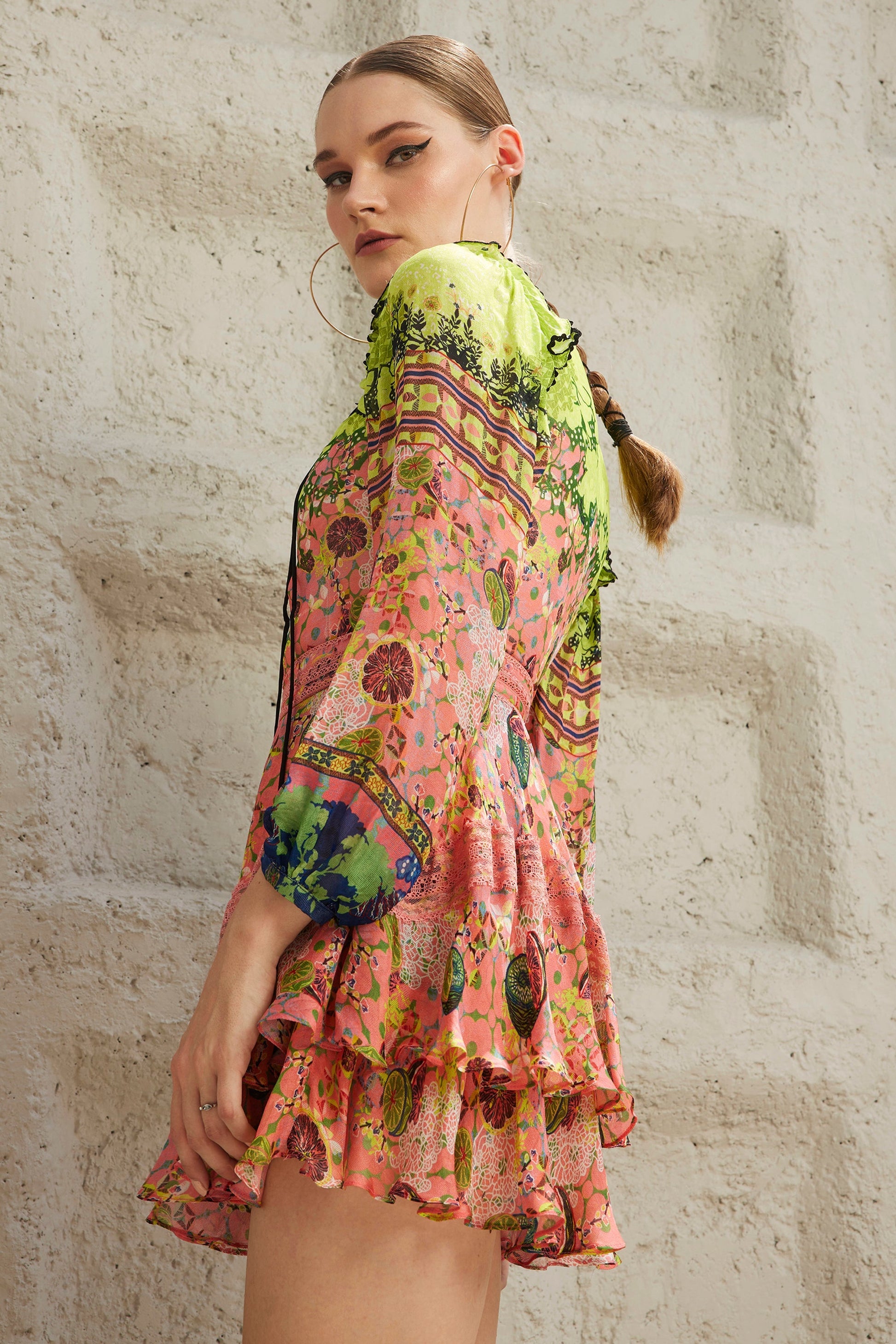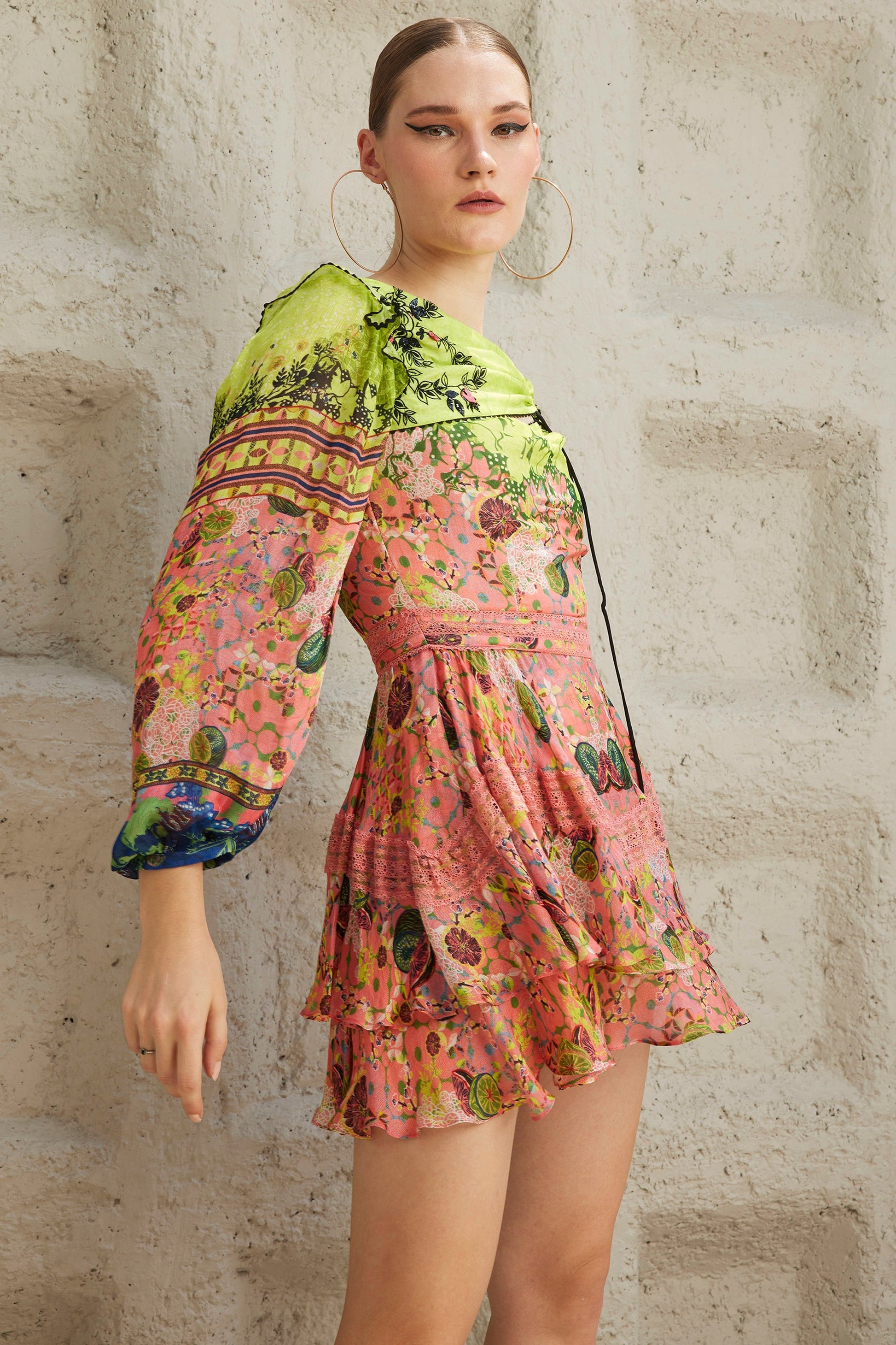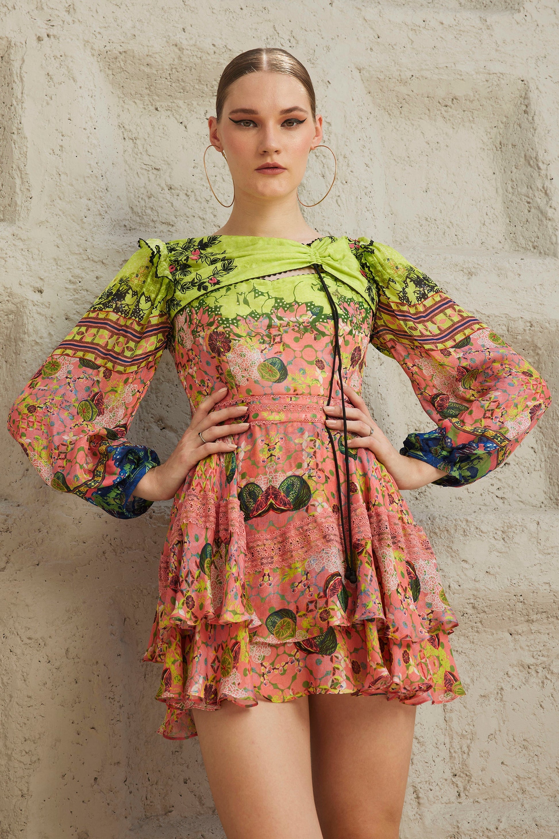 With confidence and poise, she wears her mini dress, a vision of beauty.