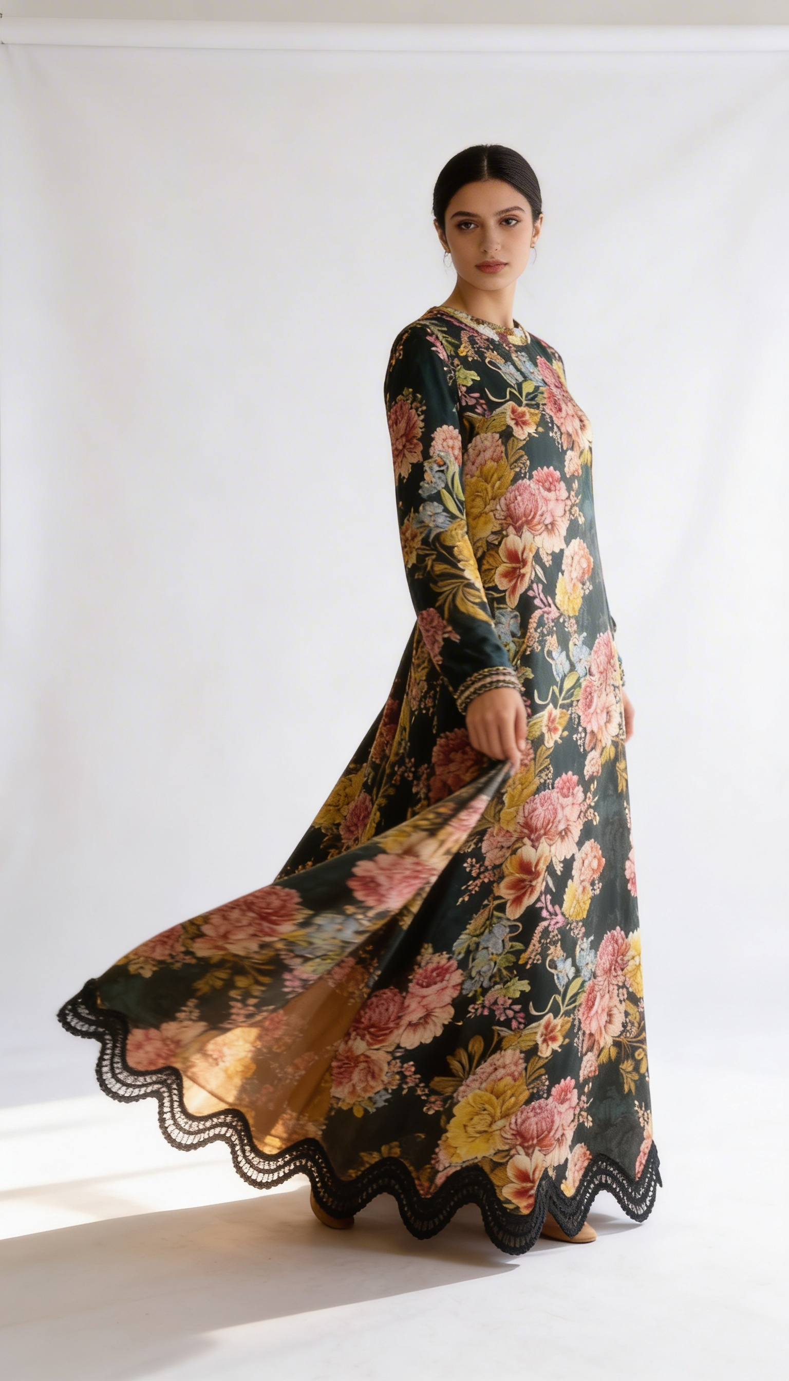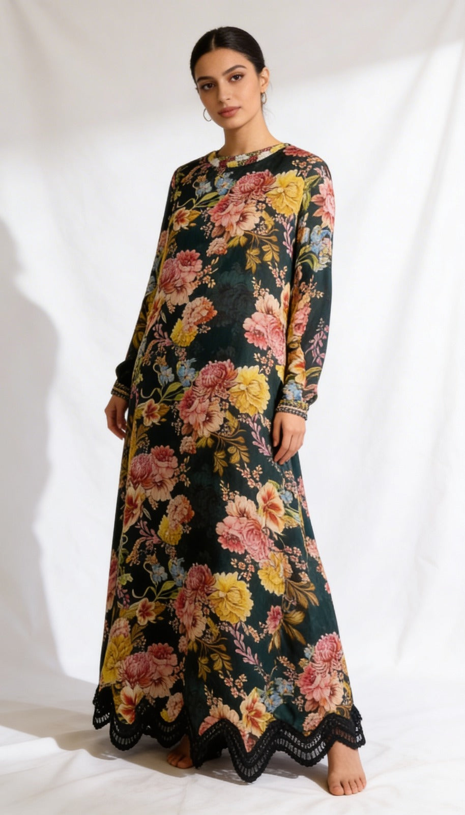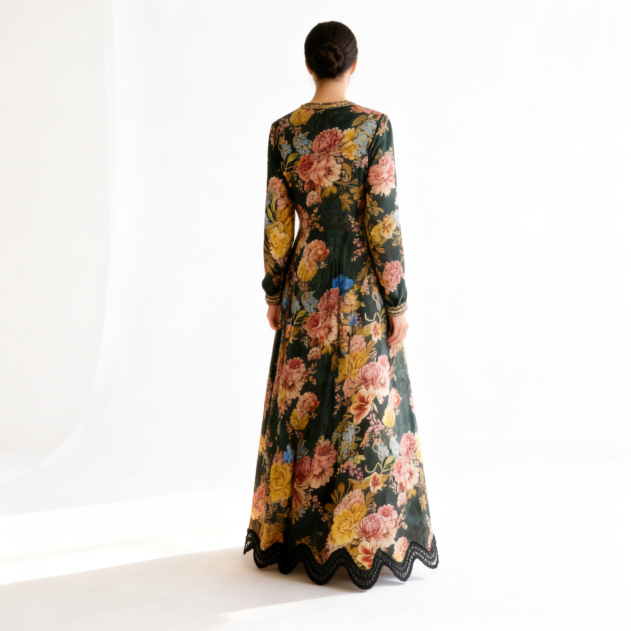 A striking maxi dress in a deep raven hue, designed for effortless elegance. Featuring a high neckline and long sleeves, its gently flared silhouette allows graceful movement and a refined, sophisticated presence. Subtle detailing along the cuffs and hem adds a delicate finishing touch, making the Raven Dream Maxi Dress perfect for evening events or special occasions where timeless style meets modern charm..
